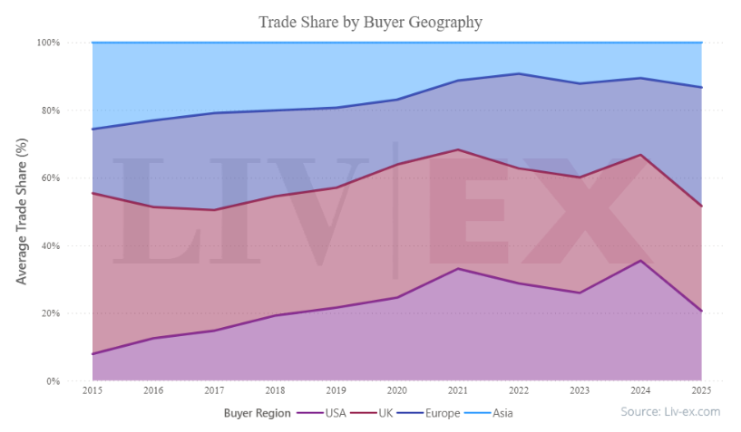 The chart above highlights one of the most important structural changes in the 2025 market. As US participation fell sharply following the introduction of tariffs, European buyers increased their share of global fine wine trade significantly. At the same time, Asian demand, while still uneven, has begun to show early signs of recovery.